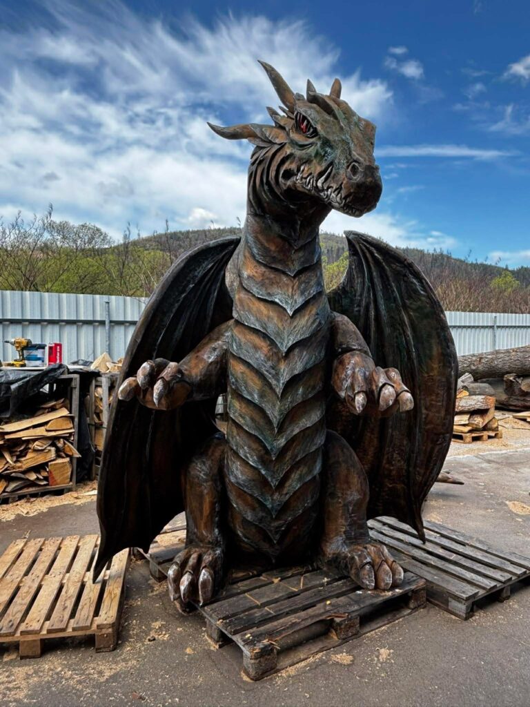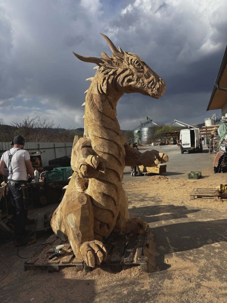 Autorom diela je rezbár Michal Kopásek z Drevený Masív. Ako vidno aj na fotografii, drak má výrazný, detailne spracovaný vzhľad – ostré pazúry, mohutné krídla a realistické črty z neho robia dominantný prvok, ktorý na hrade rozhodne neprehliadnete.